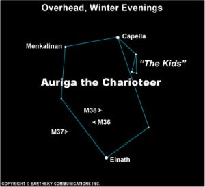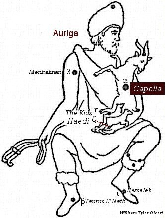 In Chinese Astronomy, Capella and four other stars in Auriga form the asterism known as “The Five Chariots” (Wu Che). The other four components are Beta, Theta, Kappa, and Gamma Aurigae (the latter being El Nath, which is now formally designated as Beta Tauri).