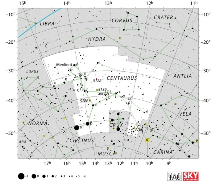 Centaurus is the ninth-largest constellation in the sky, occupying an area of 1060 square degrees. It is located in the third quadrant of the southern hemisphere (SQ3) and can be seen at latitudes between +25° and -90°. Neighboring constellations are Antlia, Ophiuchus, Scorpius, Corona Australis, Telescopium, Microscopium, and Capricornus.