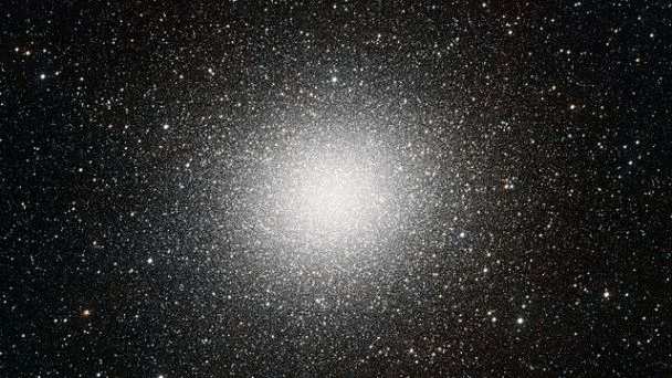 Omega Centauri is a globular cluster in the constellation Centaurus. It lies approximately 4 degrees south of Centaurus A. This cluster has an apparent magnitude of 3.7 and is approximately 15,800 light-years away. It orbits the Milky Way and is one of the largest, brightest globular clusters known associated with the Milky Way. The star cluster is visible to the naked eye.